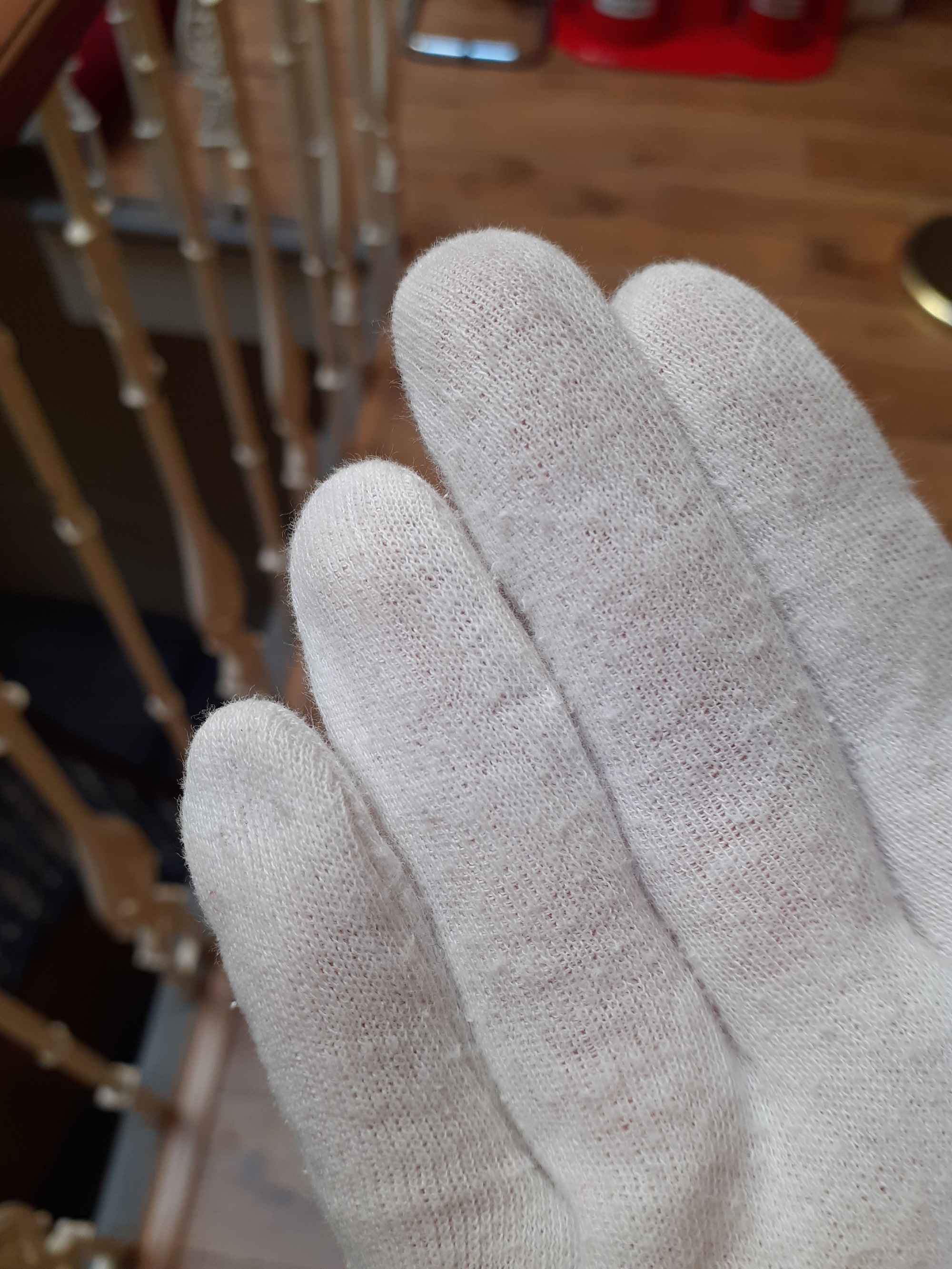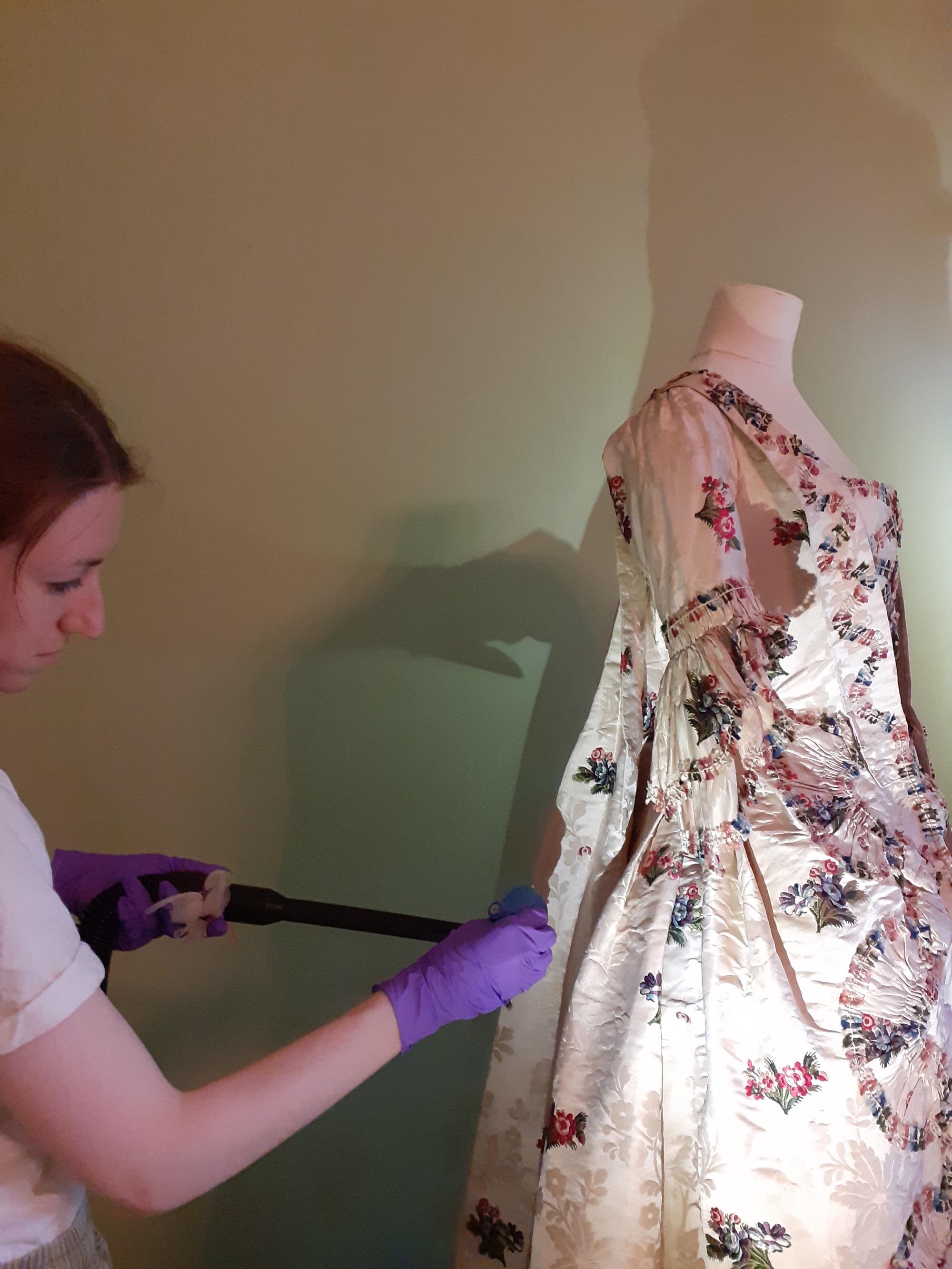 The movement of people through a space both generates and disturbs dust, sending it swirling around the room. It then settles, usually at night when the room is still, on flat, horizontal surfaces, such as the shoulders or panniers of the dress. To prevent this, dust levels need to be controlled. This is done by regular housekeeping, which is upheld at all Trust properties, and regularly cleaning the dress of loose surface dust, before it has the chance to become ingrained. This is done with a photographic puffer, which blows air across the surface into a museum vacuum. For an object as delicate as the dress, even a soft brush would risk being too abrasive on the surface. Staff also carry out regular monitoring of the dust levels, using a white glove to ascertain the extent of dust built up on surfaces near the dress.