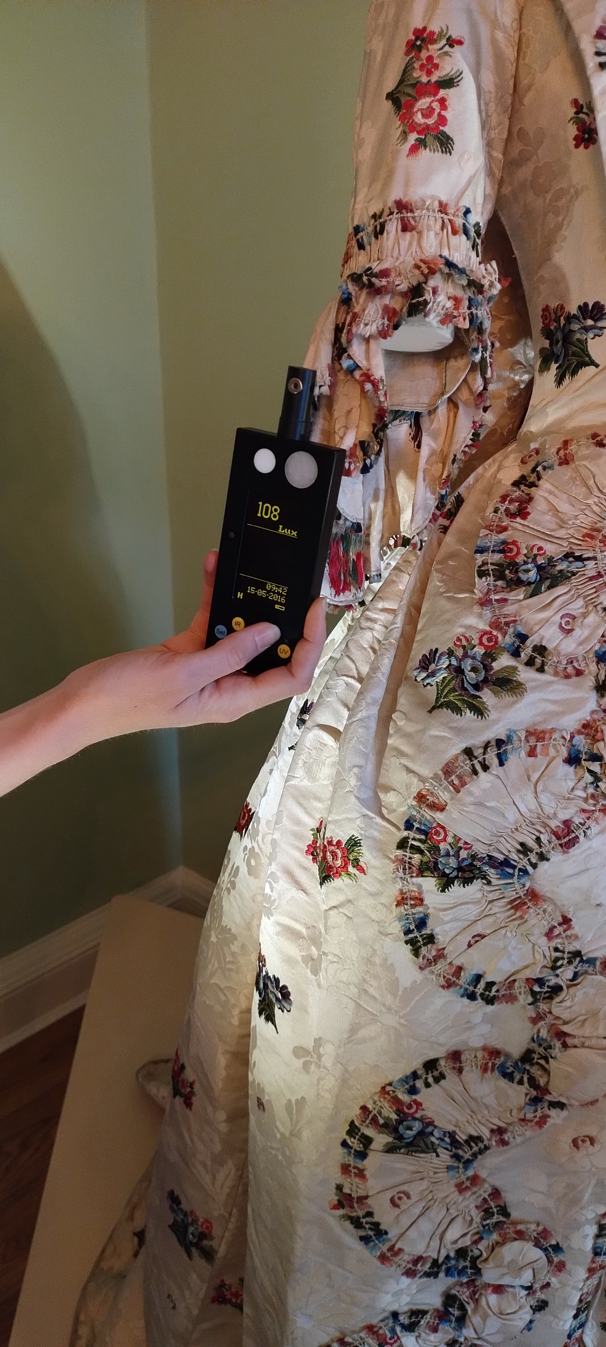 We need to accept that deterioration is going to take place, but the extent of the damage can be managed by monitoring and limiting the exposure as much as possible. Staff monitor light levels with lux monitors – lux is a unit of measurement for levels of light. There are fixed lux monitors in the room, and we also have handheld monitors, which allow us to spot test particular areas near the surface of the dress and to build a picture of the light levels there.