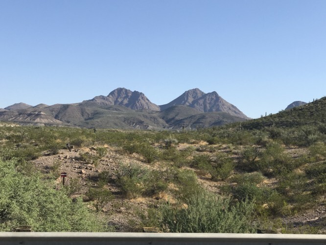 Scotland has been on his mind throughout this journey. George has a painterly eye, seeing echoes of the Scottish landscape mirrored in America’s Southwest. He’s noted with some amusement the city of Glamis, California – though the residents there pronounce it ‘Glam-iss’. By the end of his first week on the road, George made it to Phoenix where a particularly majestic mountain crag turned his thoughts back to the Highlands.