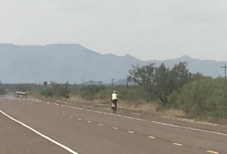 While his journey started off idyllically at San Diego’s Ocean Beach Park, George found himself slightly turned around on Day 2, near scorching hot Ocotillo, California, where his wife Mary picked him up and got them safely camped and hydrated.