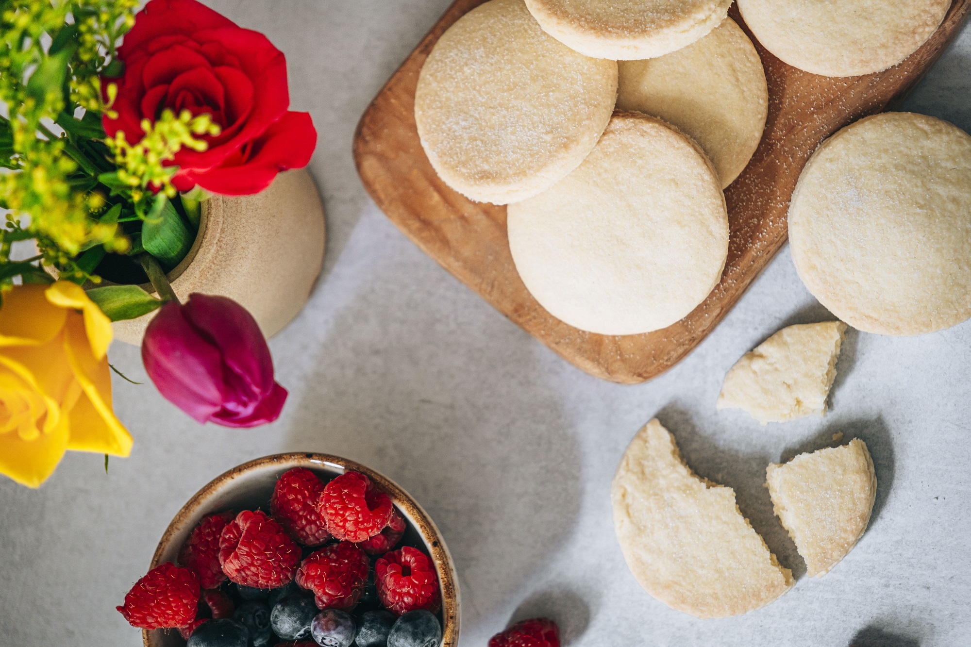 Roll out and cut into the desired shape (we do rounds at the Mackintosh Tearooms), then place them on a lined baking tray and refrigerate for at least 30 minutes so the butter has hardened again.