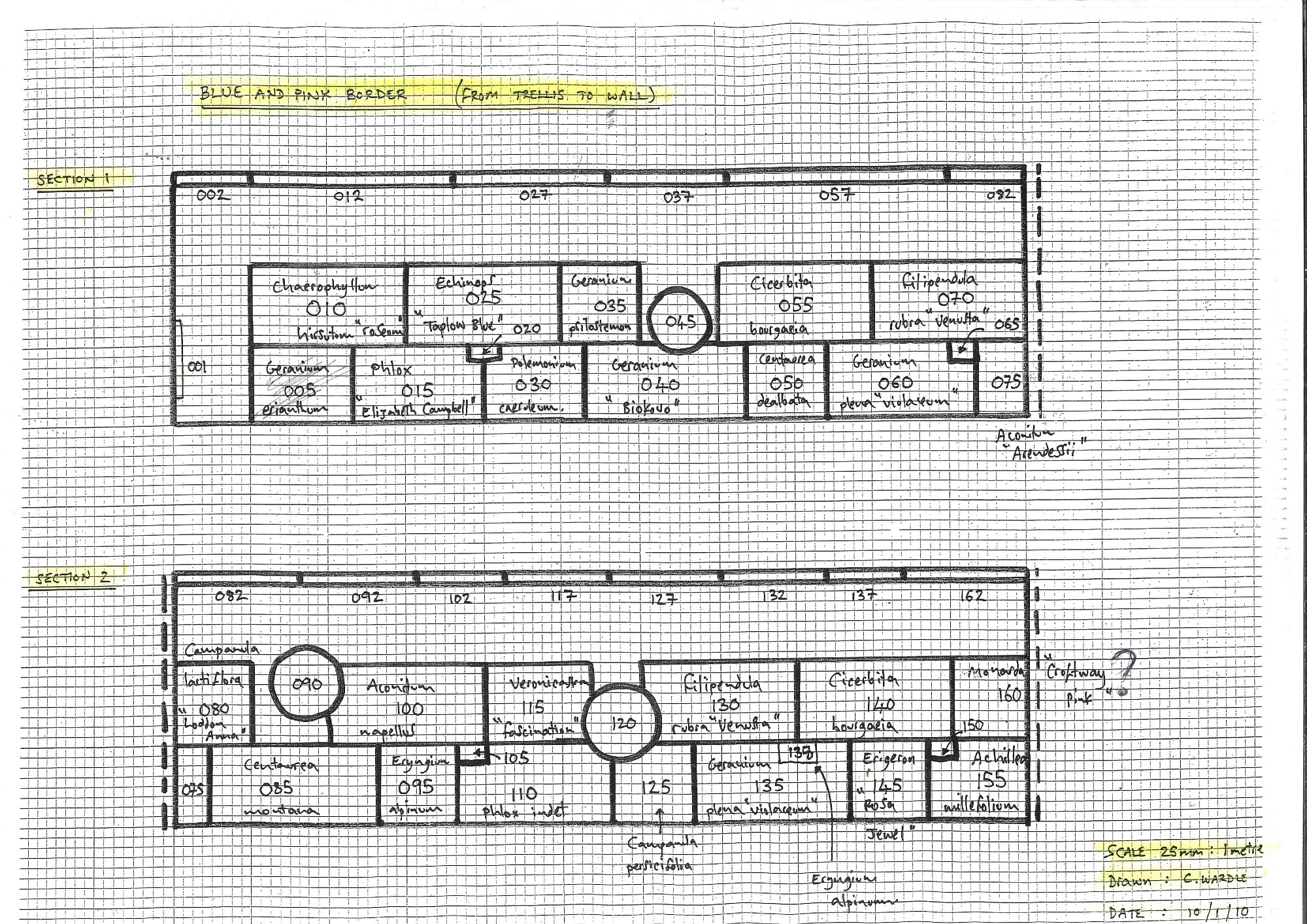 The system chosen by the project was inspired by the one that has been in use at Crathes Castle for many years. On the planting plan above (from Crathes’s Blue and Pink Border), each plant species has its own location number. Numbers begin at the left-hand corner of the bed, moving from left to right and from front to back including up the walls. Using this system, anyone will be able to locate an individual plant, tree or shrub, regardless of their knowledge of the garden. This system also offers an insight into the scope and diversity of the garden’s plants, as well as the ability to create a history and maintenance record on individual plants, and the ability to track phenology (when a plant flowers, when its leaves turn colour, etc).