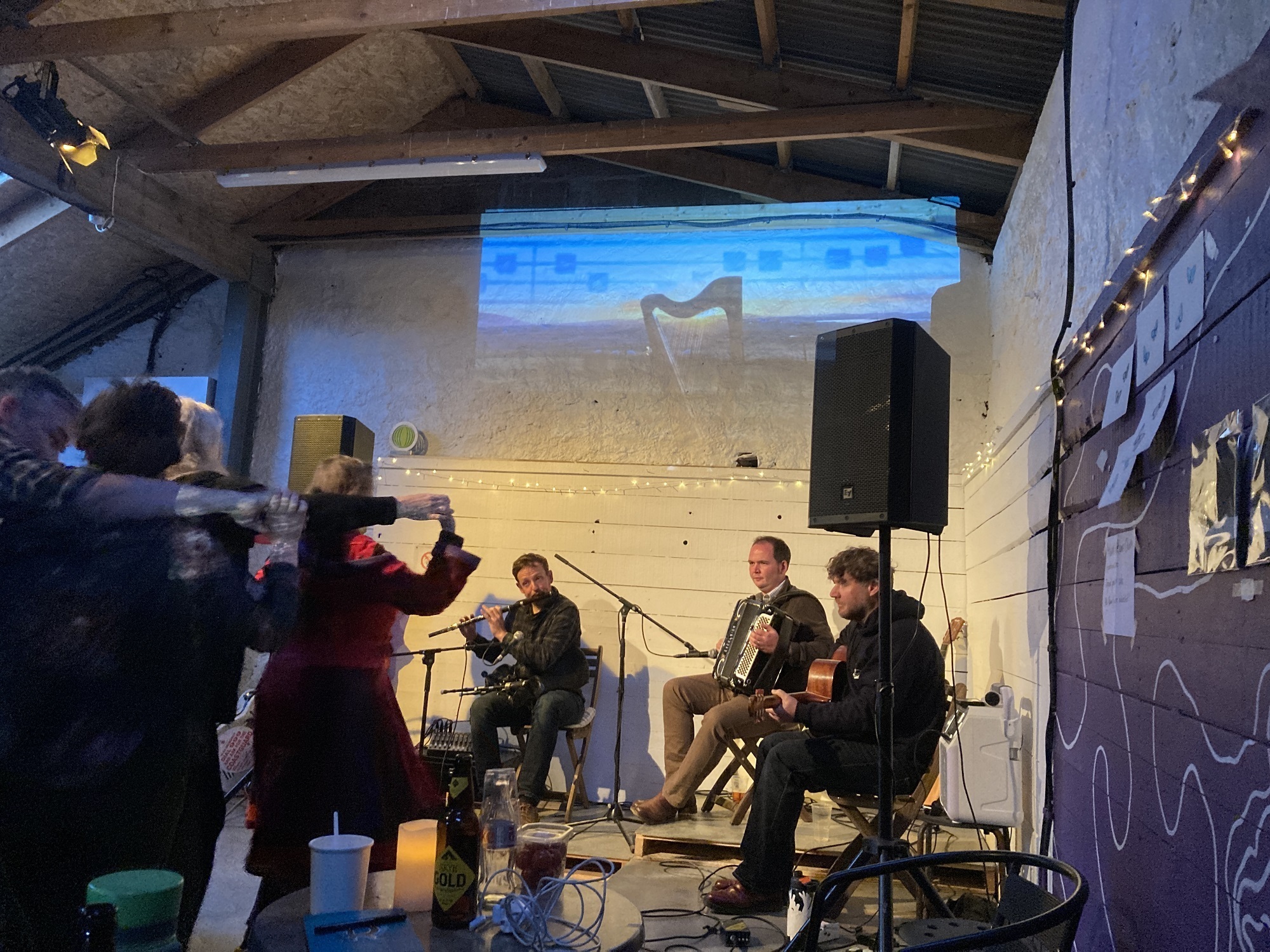 The full day of events concluded with a ceilidh in the Shearing Shed, where the rafters were ringing to the sounds of the fantastic Canna Ceilidhers band – made up of piper and composer James Duncan Mackenzie (who composed the score for the Solas film), accordion player Robert Nairn and guitarist Ross Martin.