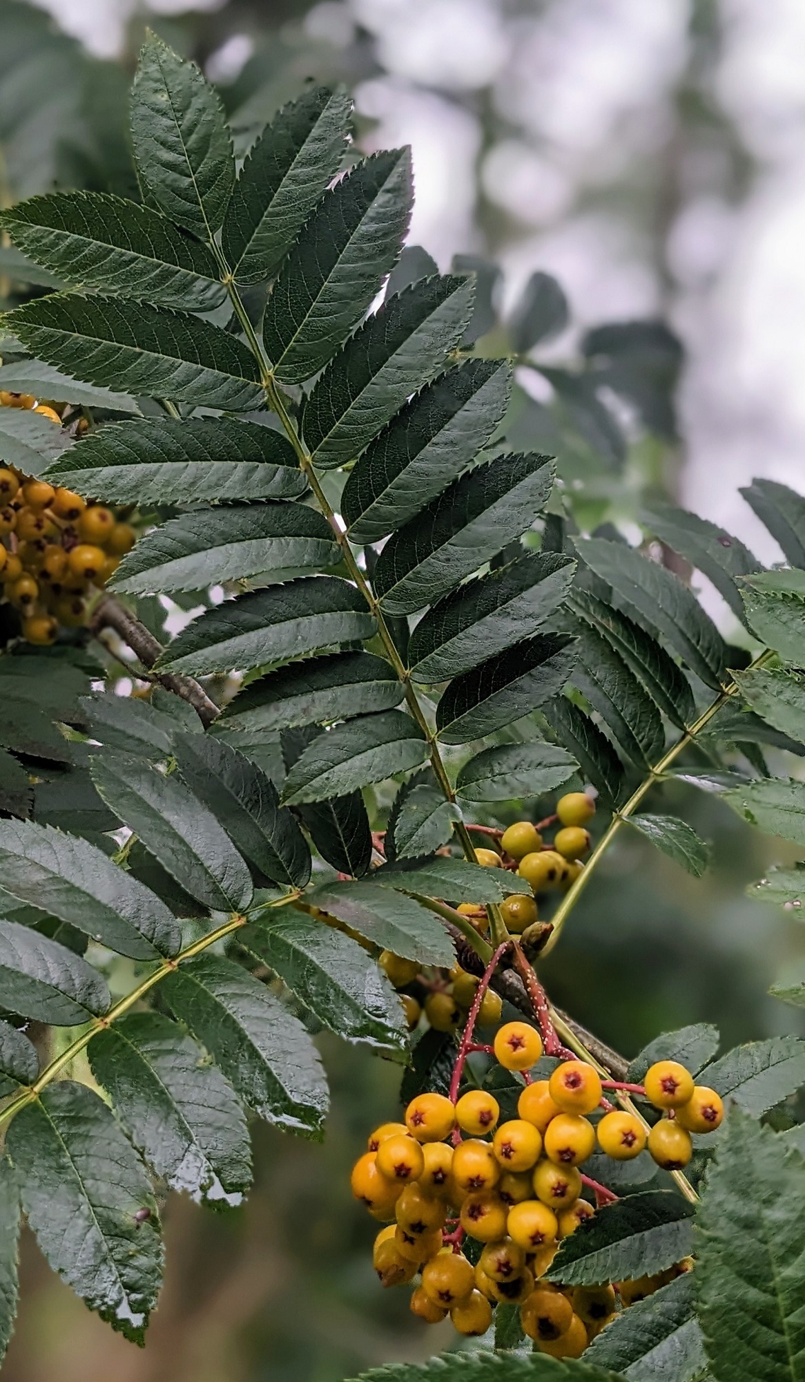 Whilst travelling to the gardens as part of the PLANTS North team I have enjoyed seeing many wild Sorbus aucuparia. Commonly known as the rowan, Sorbus aucuparia is a variable species with a wide endemic range across Europe and into Asia. It’s also known as the mountain ash, due to its preference for mountainous habitats and its superficial similarities to the ash (Fraxinus ssp). Both produce odd-pinnate compound leaves – comprising pairs of lateral leaflets (leaf-like parts of a compound leaf) attached directly to a central stalk with a single terminal leaflet. In Sorbus aucuparia the leaves are alternately arranged on the branch, each leaf having 6–8 pairs of leaflets, oblong to oblong-lanceolate in shape, with sharply toothed margins that extend nearly to the base of the leaflet.