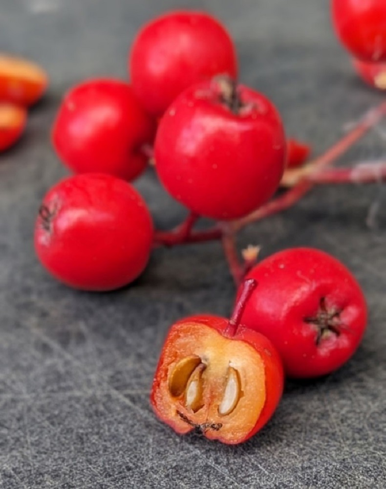 The fruits of Sorbus aucuparia, although often referred to as berries, are technically pomes, like apples and pears, with a central core containing seeds surrounded by a fleshy part. The remnants of the persisting sepals can be seen as a star shape at the base of the pome. They are very bitter and astringent but can be processed by cooking or freezing, which degrades the acidity. They are sometimes used to make jams, jellies, syrups and drinks. High in vitamins A and C, they were previously used as a prevention against scurvy. More recently, the antimicrobial agents derived from sorbic acid, first isolated from the distillation of rowan berry oil in 1859, are often used to prevent mould in food and drinks.