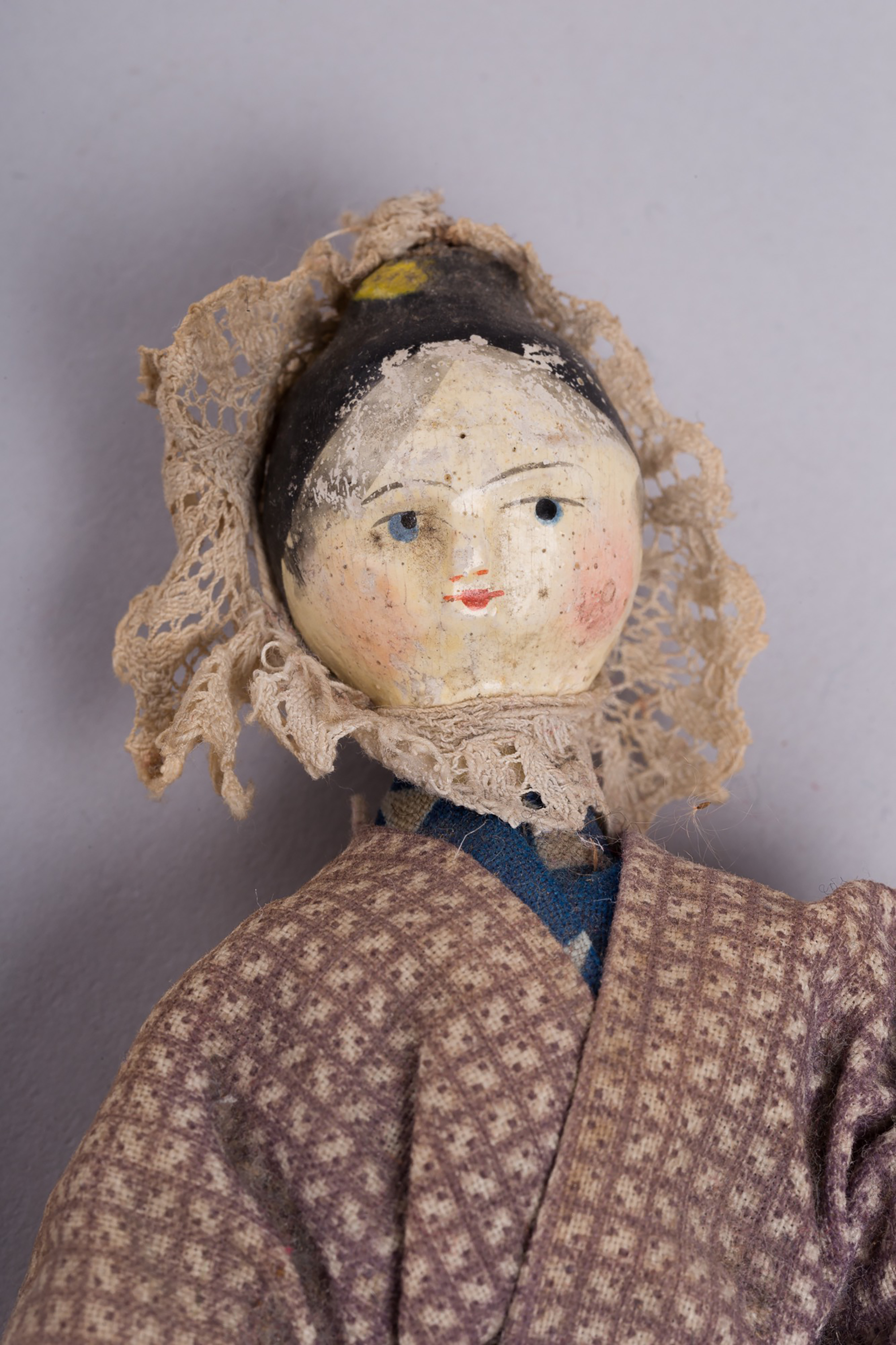 The doll from Weaver’s Cottage has a papier-mâché head and torso with hand-painted details, and wooden legs and arms. Papier-mâché is a composition of pieces of paper or pulp and bound with some sort of adhesive, which can be moulded into various shapes when wet and becomes very hard once dry.