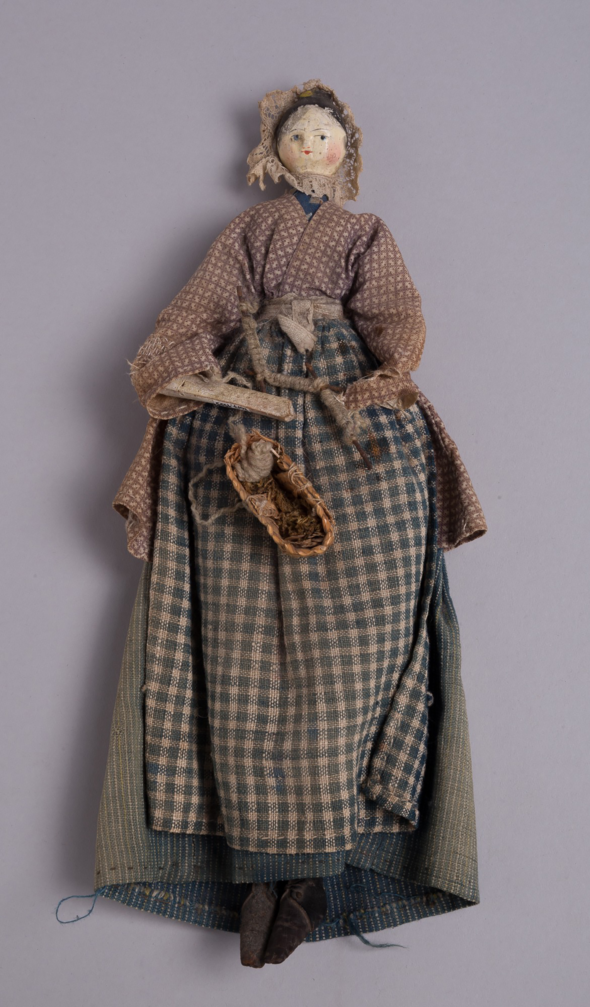 To reinforce the value of the doll as a ‘living’ example, it appears to be holding a little wicker basket and is knitting wool, or perhaps creating a thread that could have been used in one of the many looms that were in Kilbarchan at the time.