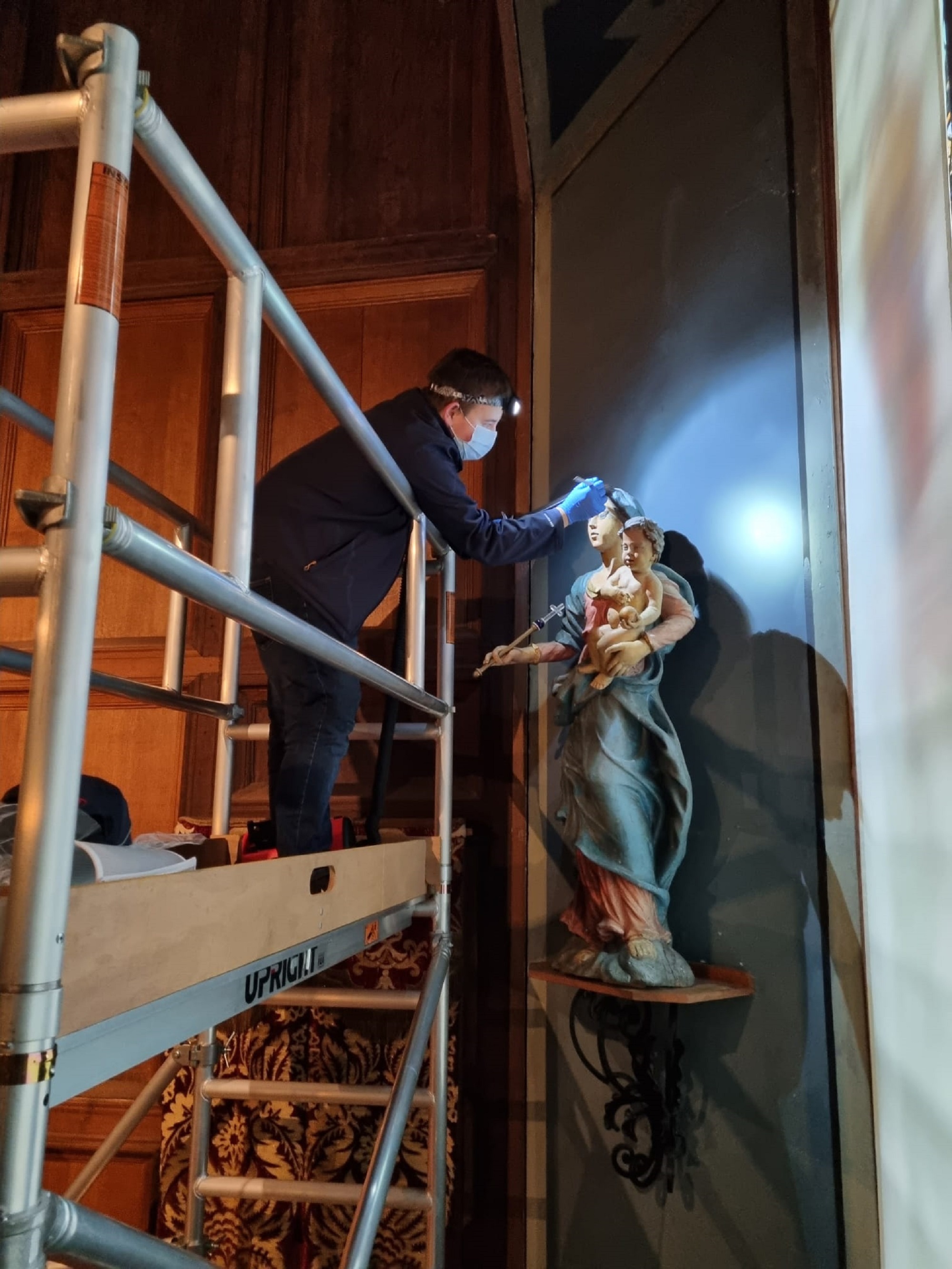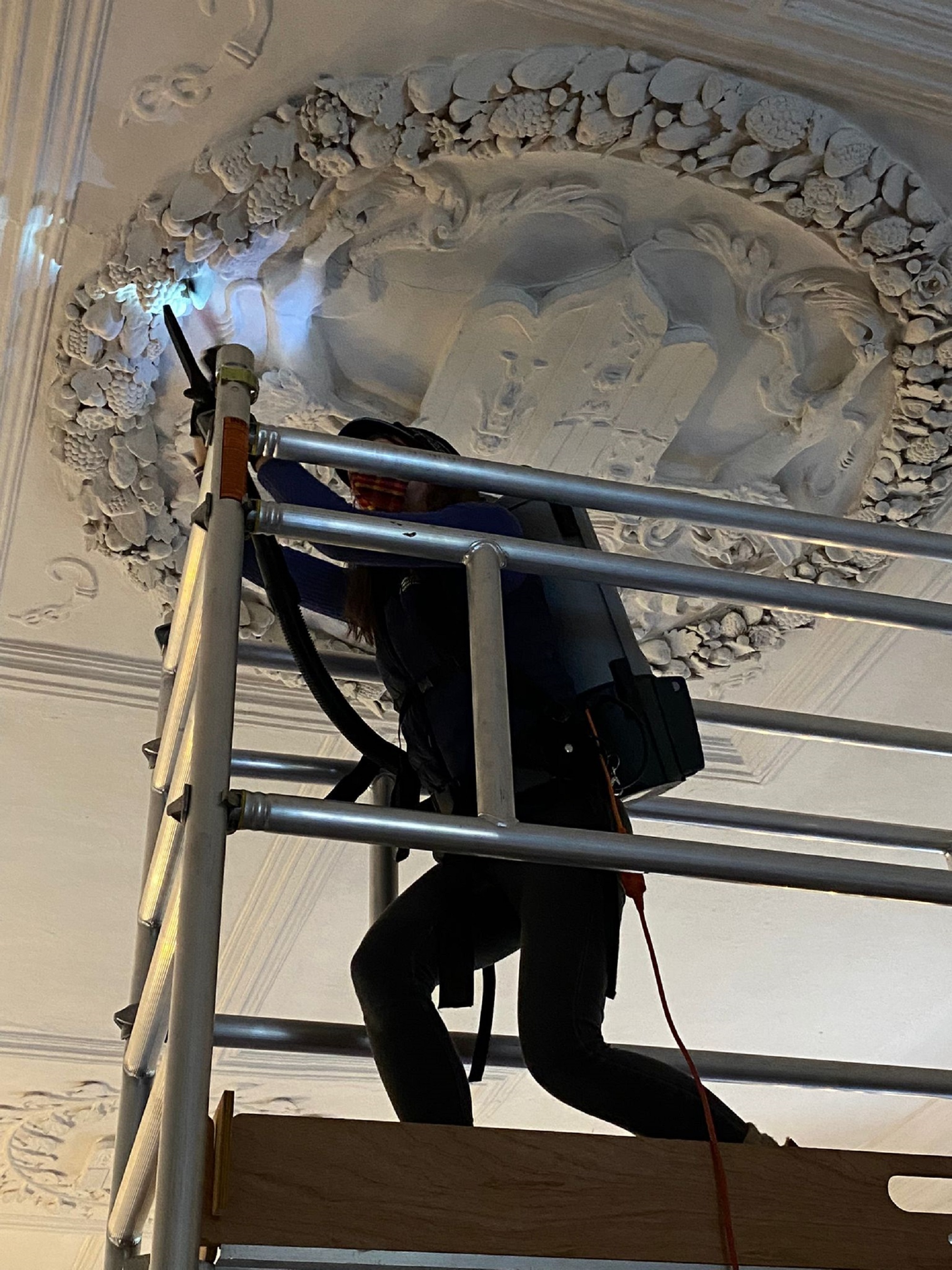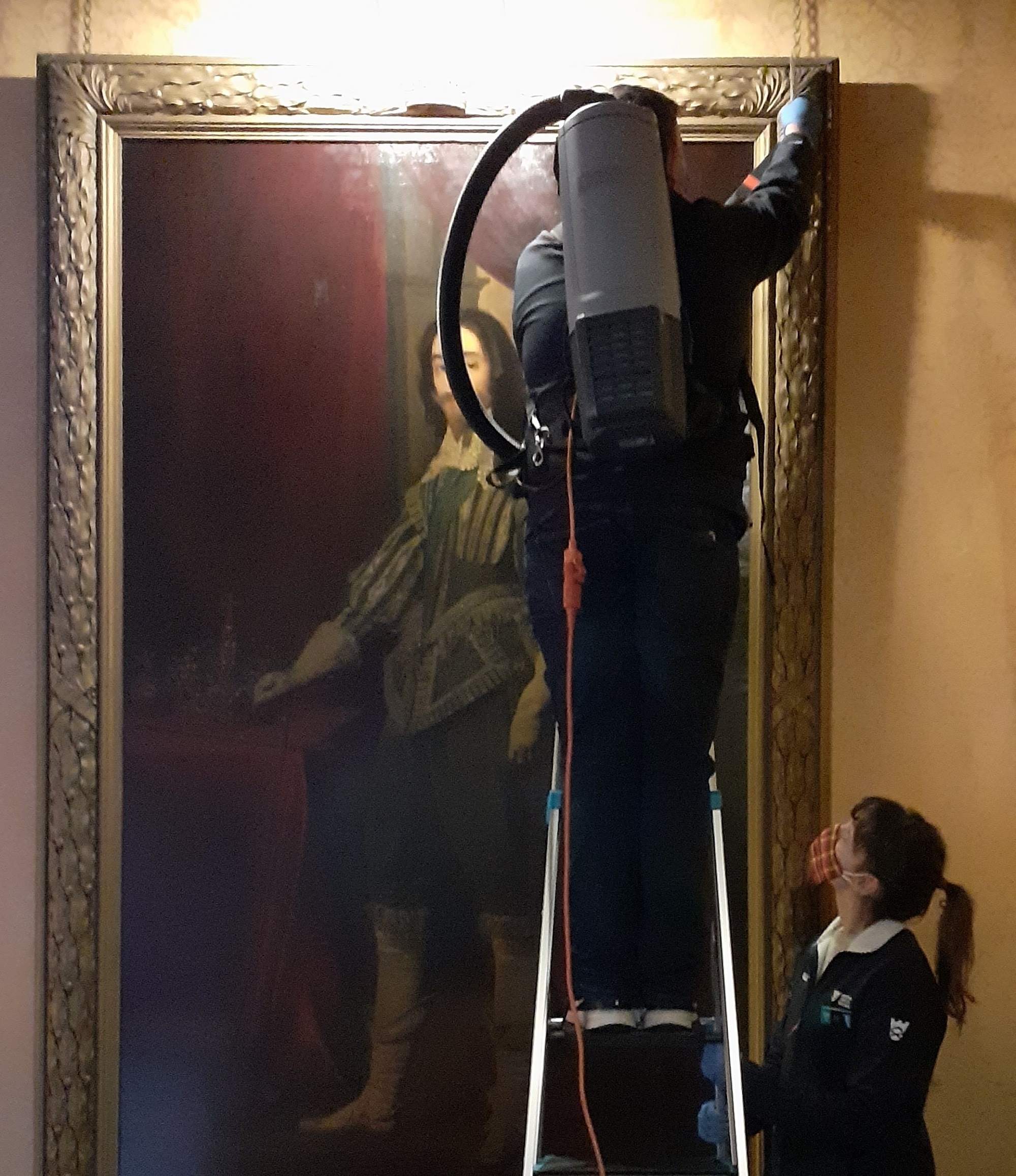 As some of our necessary conservation work involves working at height or in very large rooms, the Collections Care teams carry out much of the more in-depth cleaning and trickier housekeeping tasks when properties are closed. This allows us to set up scaffold towers and ladders to reach chandeliers, artwork, pelmets and ceilings. The teams carefully clean these rarely accessed areas with conservation-graded cleaning materials and soft brushes, delicately removing dust and cobwebs.