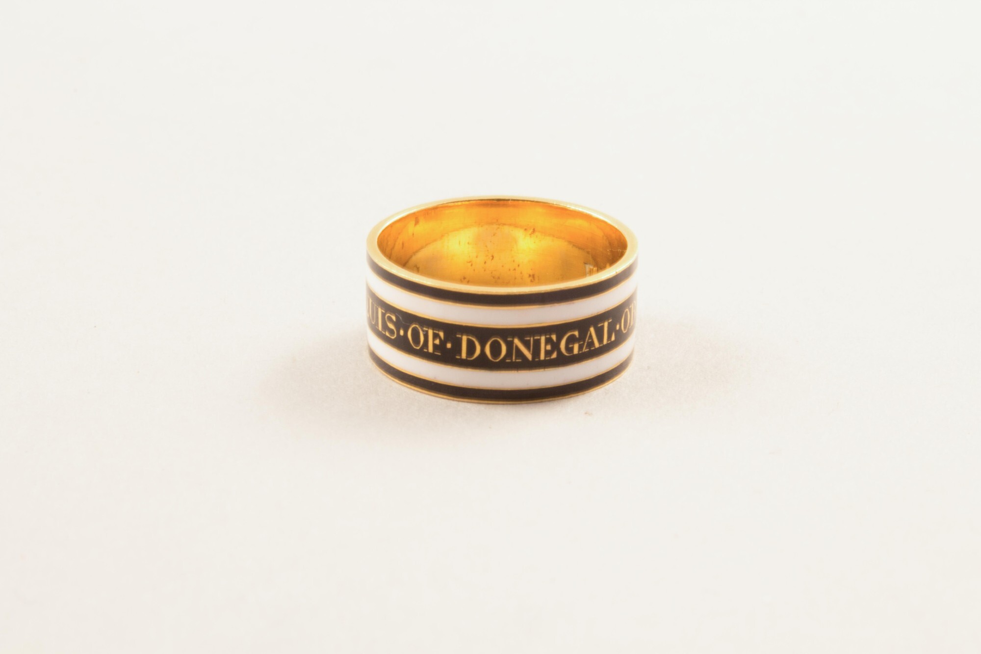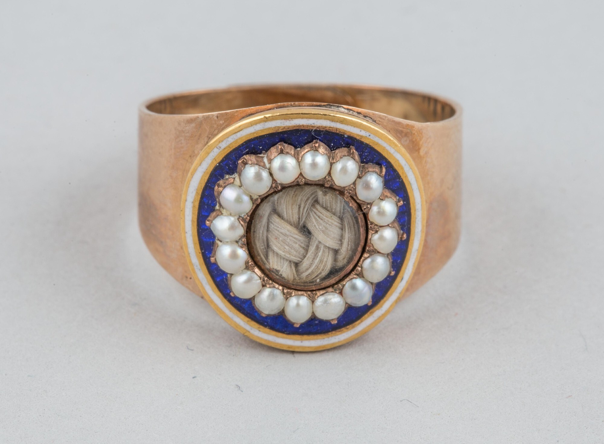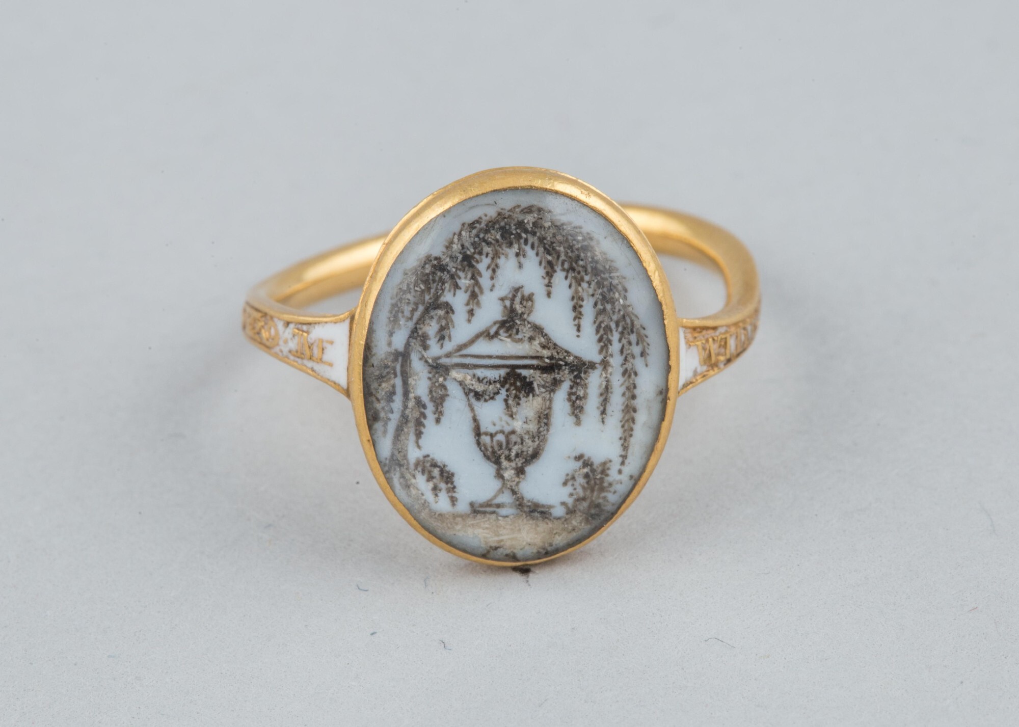 The distribution of mourning rings by those with wealth was common practice by the late 18th century, though the custom had been around since at least the 17th century; apparently Samuel Pepys ordered 123 mourning rings for distribution after he died. At Brodick Castle and Leith Hall there are whole sets of black enamelled rings, bearing the names of the deceased and dates of death. There are multiple versions of small plain rings which may have been worn by lesser family members or servants for a prescribed period of mourning. Broader, heavier rings were possibly intended for wear by men. They build a picture of a very structured approach to death, as well as a willingness to embark upon outward mourning for sometimes quite distant friends and relations. Other, decorative rings feel more personal, enclosing hair and incorporating engravings, typically of urns and weeping willows, or studded with pearls to symbolise tears. Several of these remember children.