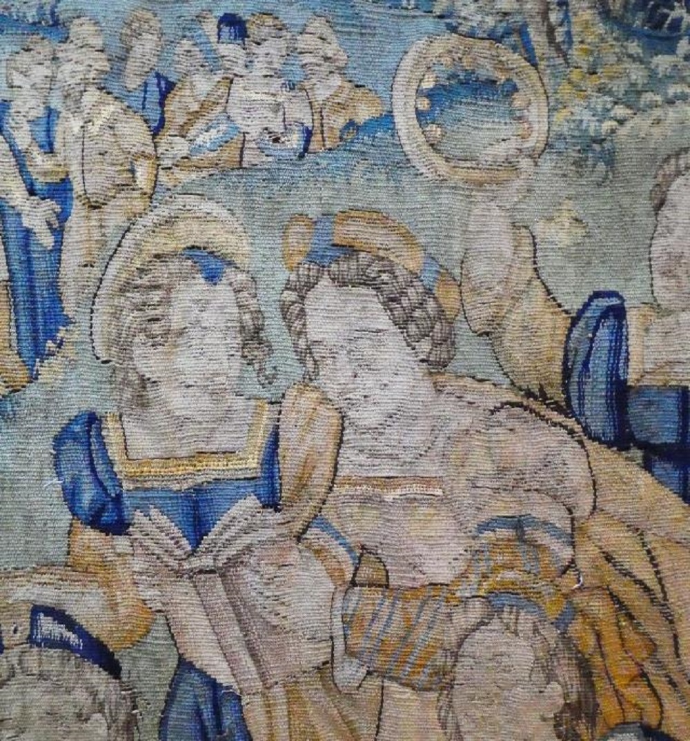 I could not reconcile the tapestry depicted in the painting with the tapestries on display in the castle, whether as hangings or as smaller furnishings. This was puzzling since it had clearly been an important piece. And so I set out to find it, and enlisted Sophie’s help as well as that of Bill Bleakley, Collections Care assistant. I was delighted when Bill discovered a fragment of the tapestry in the form of a re-made door curtain; it had been rolled up and stored away many years ago, perhaps when the castle was sold to the National Trust for Scotland. My perseverance having paid off, I was able to unroll and study the story before me.