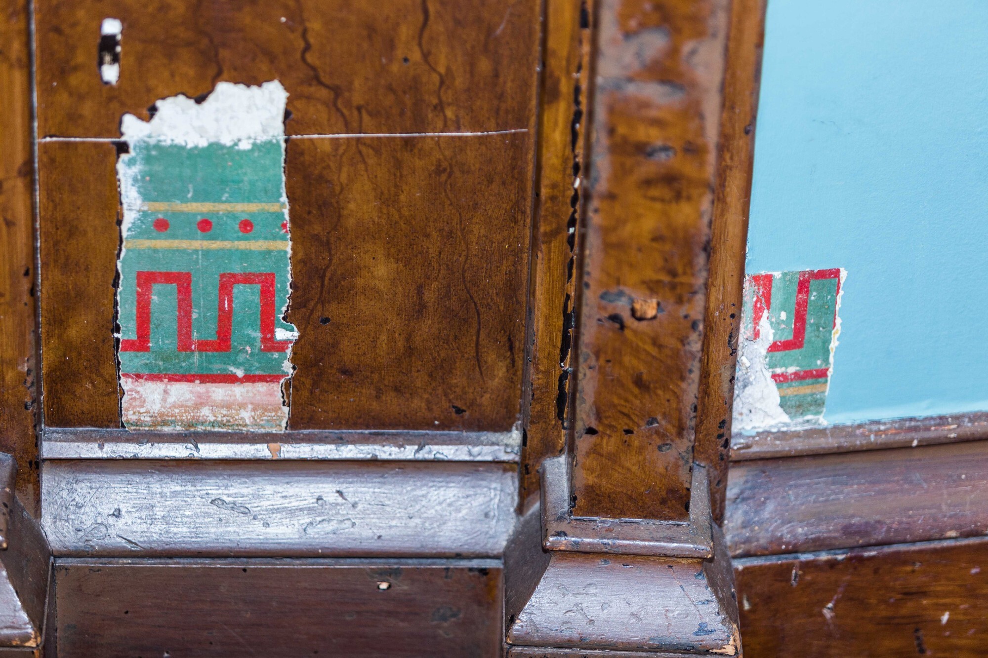 The other knotty problem in the parlour is the woodwork, which plays a prominent part in the overall scheme. Around 1920, 60 years or so after Alexander Thomson first completed the room, the woodwork was given a makeover, covering the original brown varnish with a walnut paint effect. We have debated long and hard about whether to leave this alone, since the overall impression is still of dark wood, or to try to recreate the brown varnish on top. Our whole ethos at Holmwood has been to preserve the work of previous generations, with a suitable reversible barrier layer in-between, rather than stripping away evidence of the past and starting again. Since the 1920s makeover has a value of its own in the history of interior paint effects, we have decided to leave it for now and see how it sits once the wall decoration is complete. In this case it’s better not to rush into things.