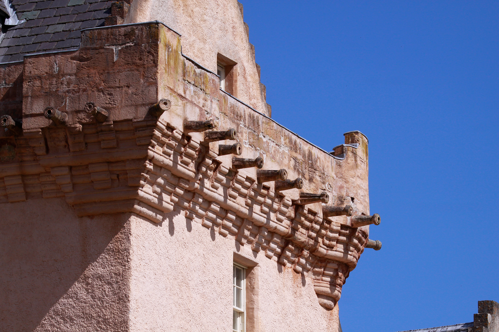 The exact construction date of the present building is not known, although the caphouse on the south-west tower bears the date 1567, which probably records the completion of that part that had begun in 1560. Alexander Brodie of Brodie was the 12th Laird at the time.