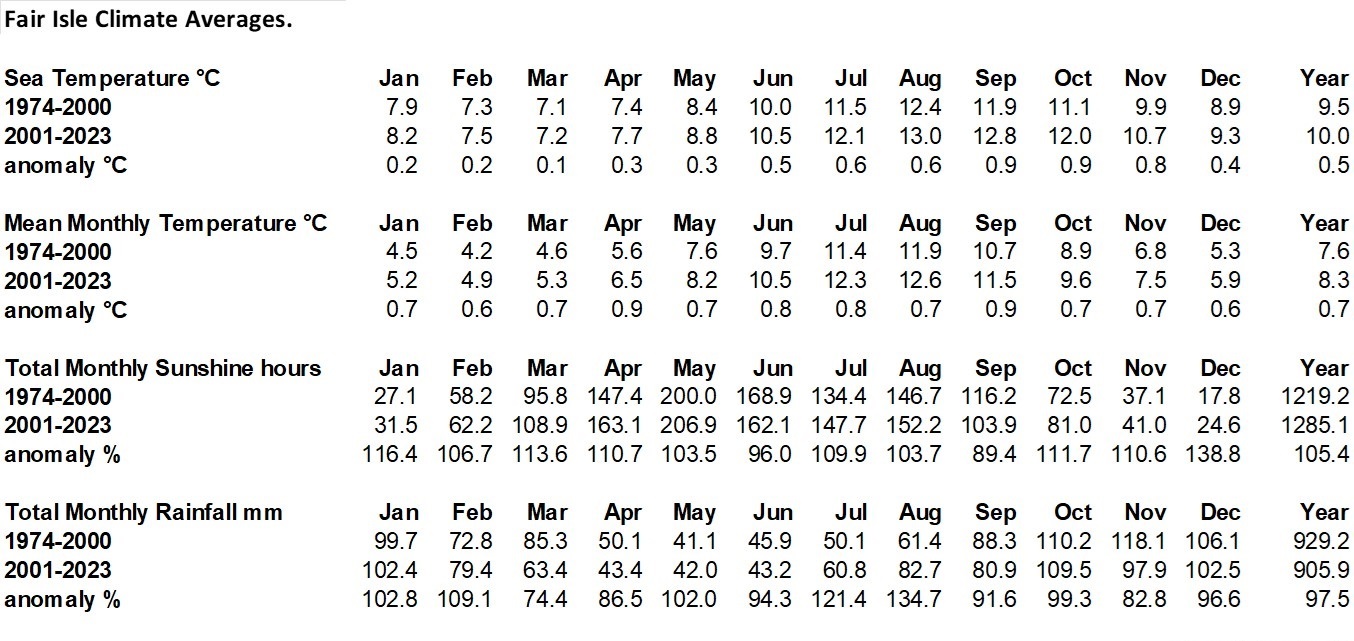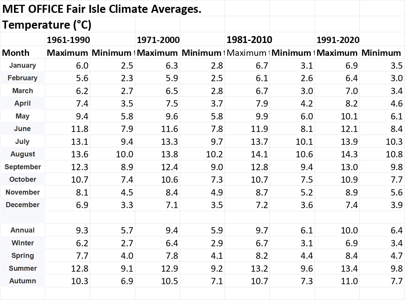 During spring and summer Fair Isle often reports the lowest daytime maximum temperature in the British Isles – even though (in May and early June) it may at the same time be the sunniest place in the country and experiencing its warmest day of the year to date! As sea temperatures do not reach their highest values until late summer, it is at this time when the maximum temperatures on Fair Isle often occur – mostly around 16°C or 17°C. For many years, the 20.2°C recorded in August 1975 remained the highest temperature officially recorded on Fair Isle. Records are usually only beaten by small amounts, but in July 2022 the hottest day was exceeded by 2.4° when the temperature reached 22.6°C.