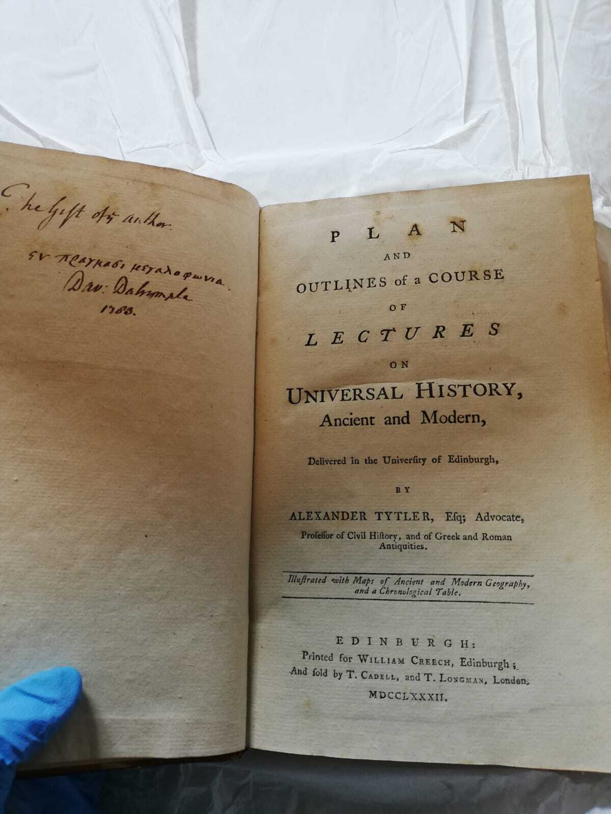 The collection was started by Hailes’ grandfather, Sir David Dalrymple, who added a new wing to Newhailes to house it, almost doubling its size; Lord Hailes then expanded it, including with his own numerous publications. Much of the collection, along with the family archives and papers, is now held in the National Library of Scotland (NLS), which describes it as the ’most important contemporary collection to survive from the period of the Scottish Enlightenment’.