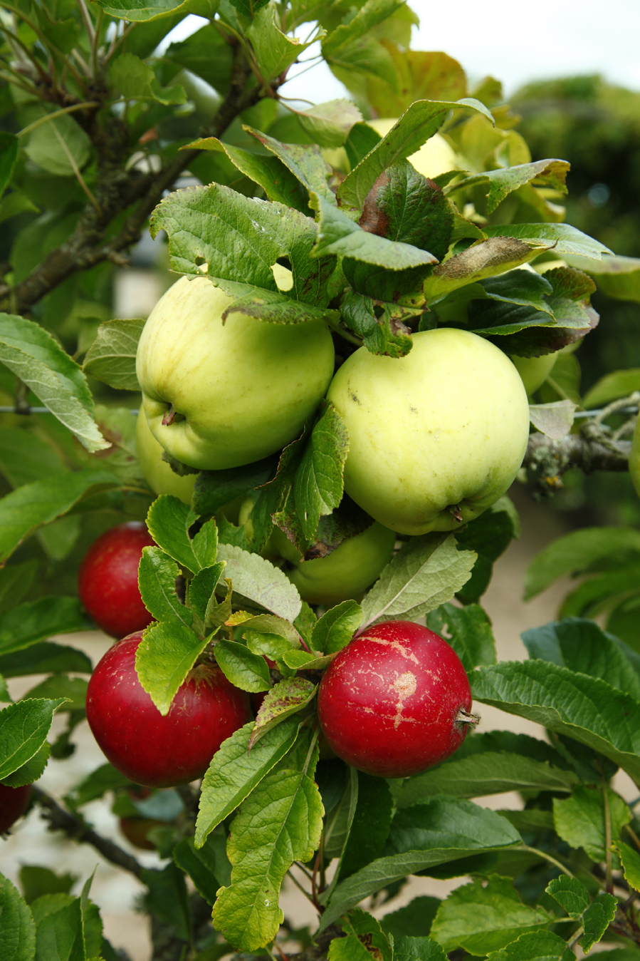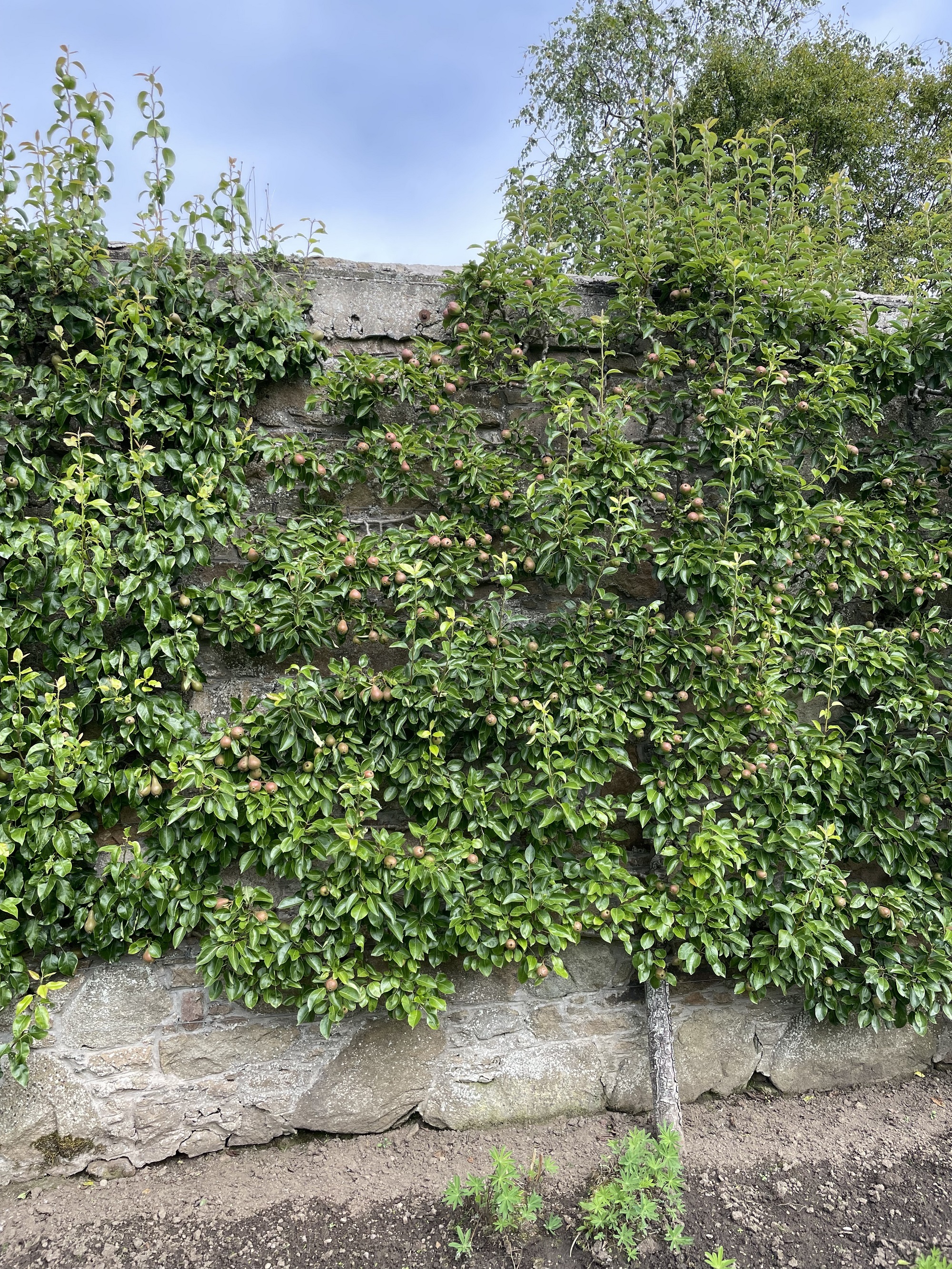 Free-standing trees in the orchard are on semi-vigorous rootstock for bushes and on vigorous rootstock for half standards (trees with a trunk up to 5ft tall). Trees on the south-facing wall are trained as fans. Trees on fences are trained as small fans, cordons, step-overs and candelabras – these are all on semi-vigorous rootstock.