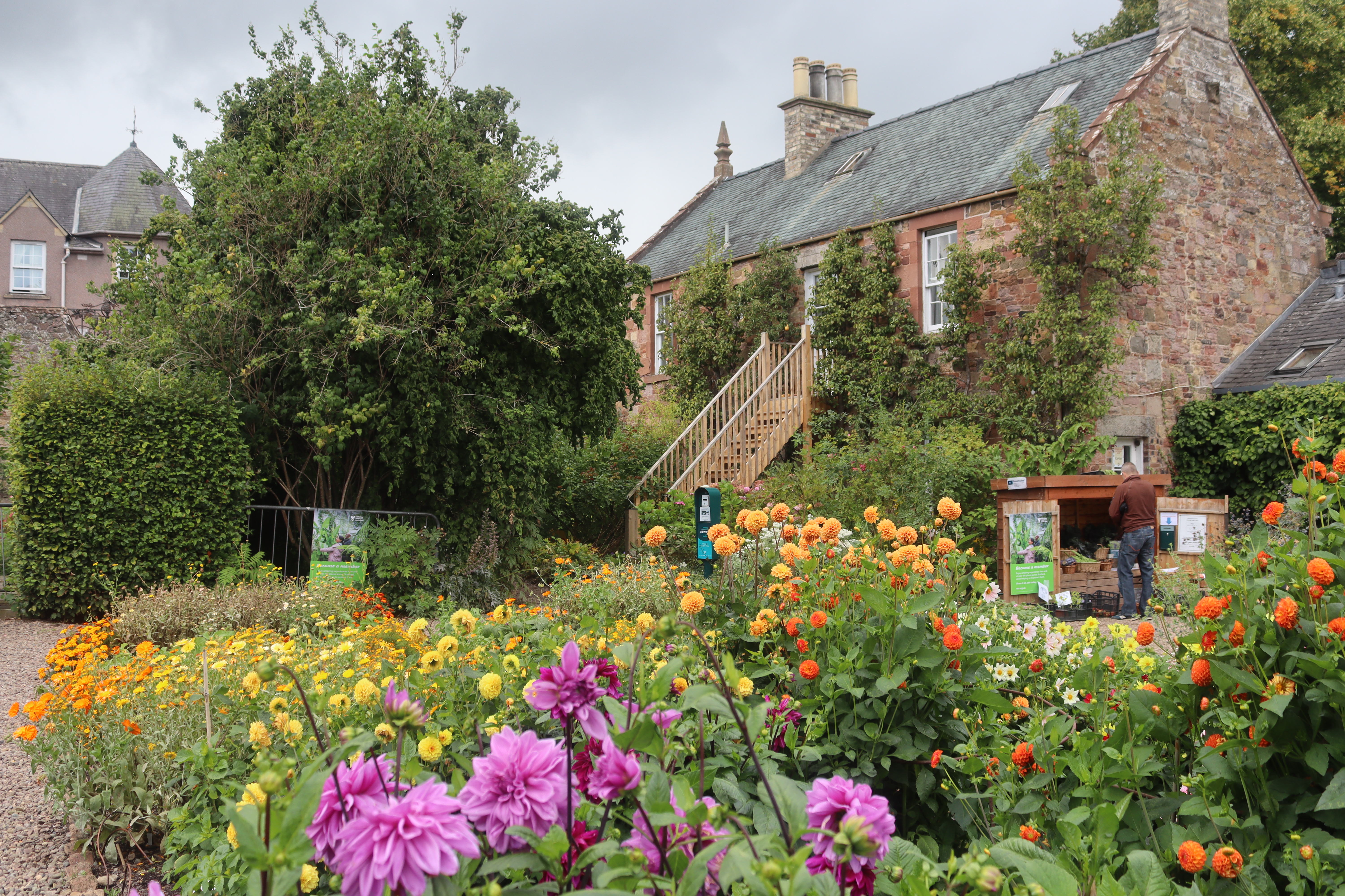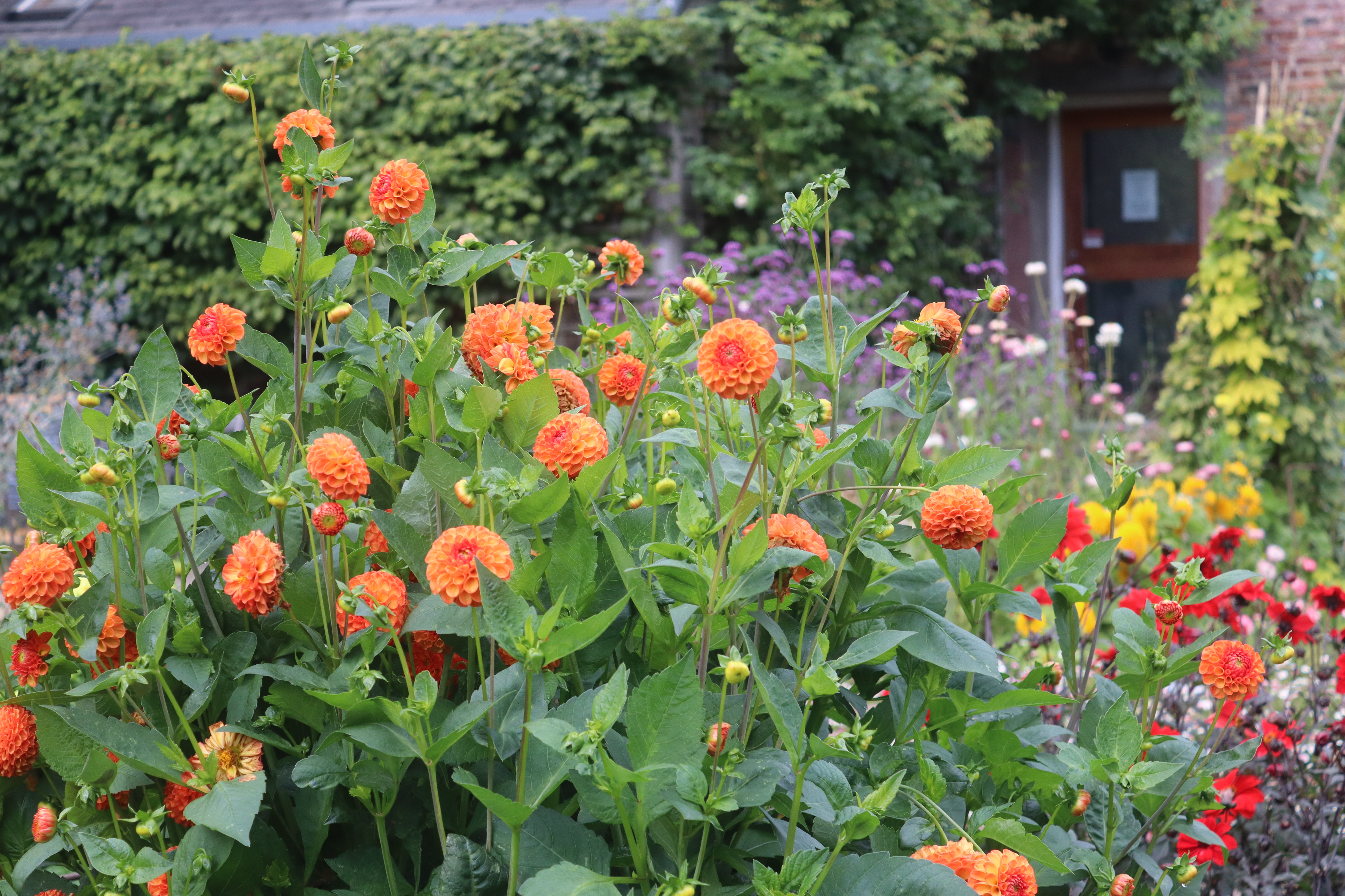The herbaceous border runs down the middle of the main garden area. It has been used from the mid-1970s as a cutting bed for dried flowers. We have recently cleared it due to a bindweed problem and redesigned it as a bed of two halves – one half with hot colours and the other with cool colours – with all the plants chosen for either cutting or drying use, in addition to an ongoing collection of dahlia varieties, which put on a colourful show from July through to the end of October.