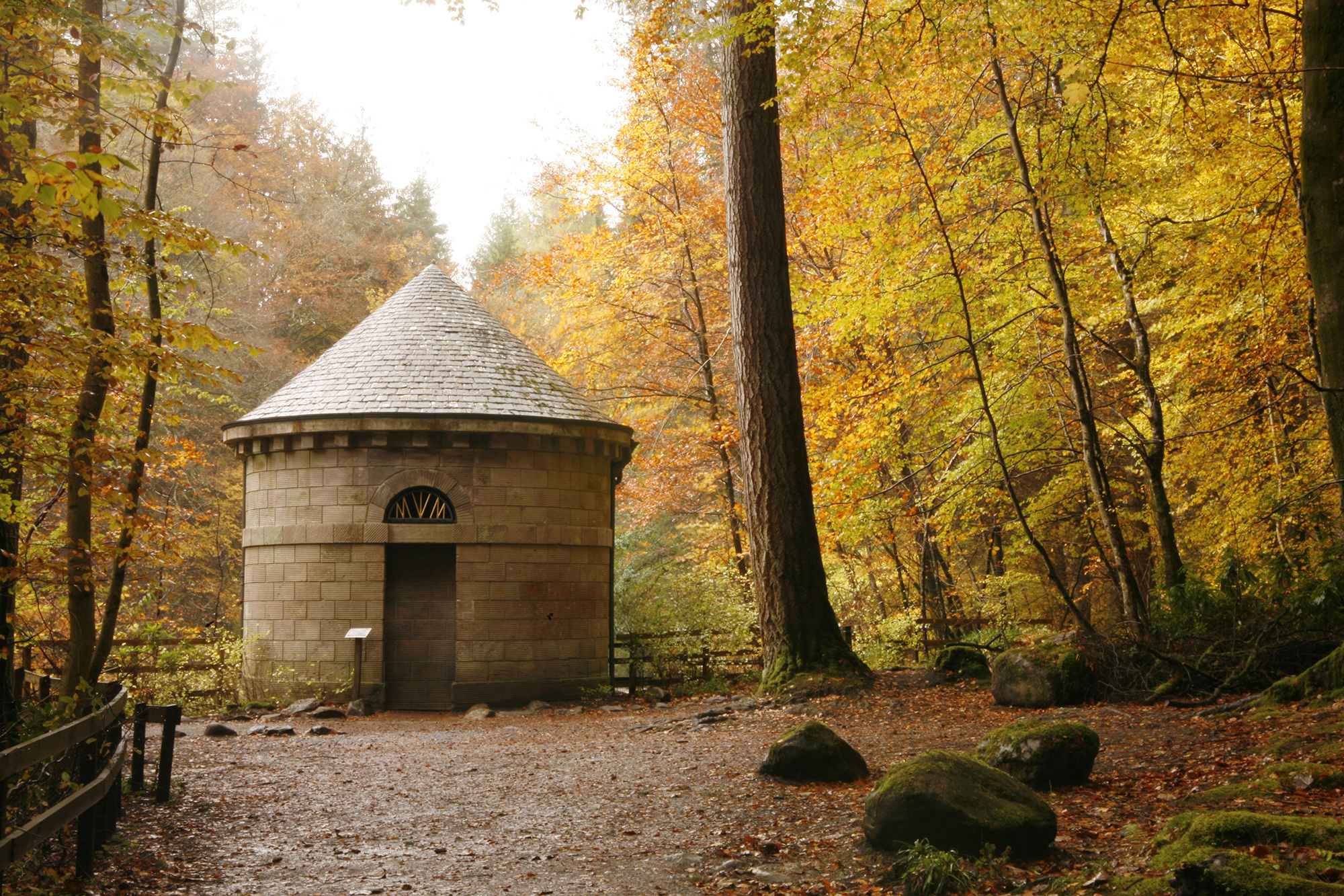 The original building here was a summerhouse built in 1757 as a retreat from the pressures of daily life – a hermitage, which gave the place its name. Ossian’s Hall was built in 1782–3 to replace the summerhouse. The exterior was transformed to look like a small circular temple, while inside a luxurious drawing room was decorated with plasterwork, paintings and mirrors.