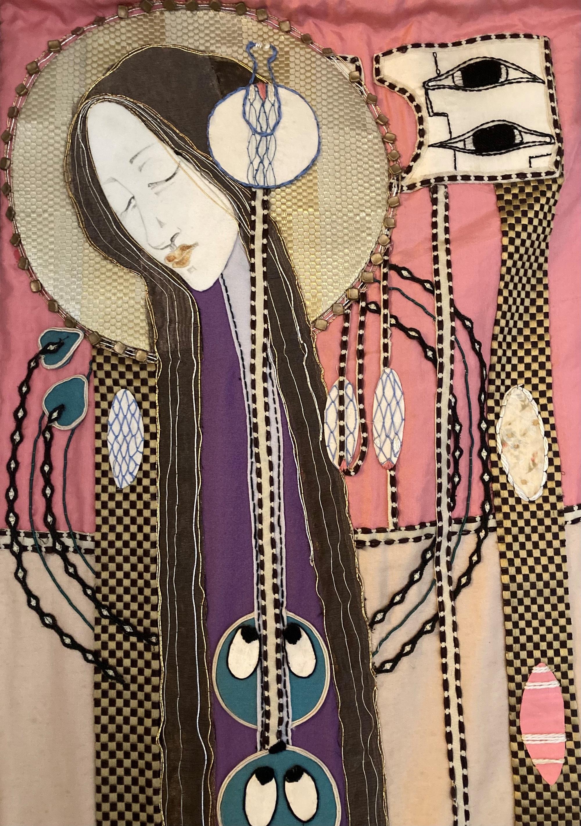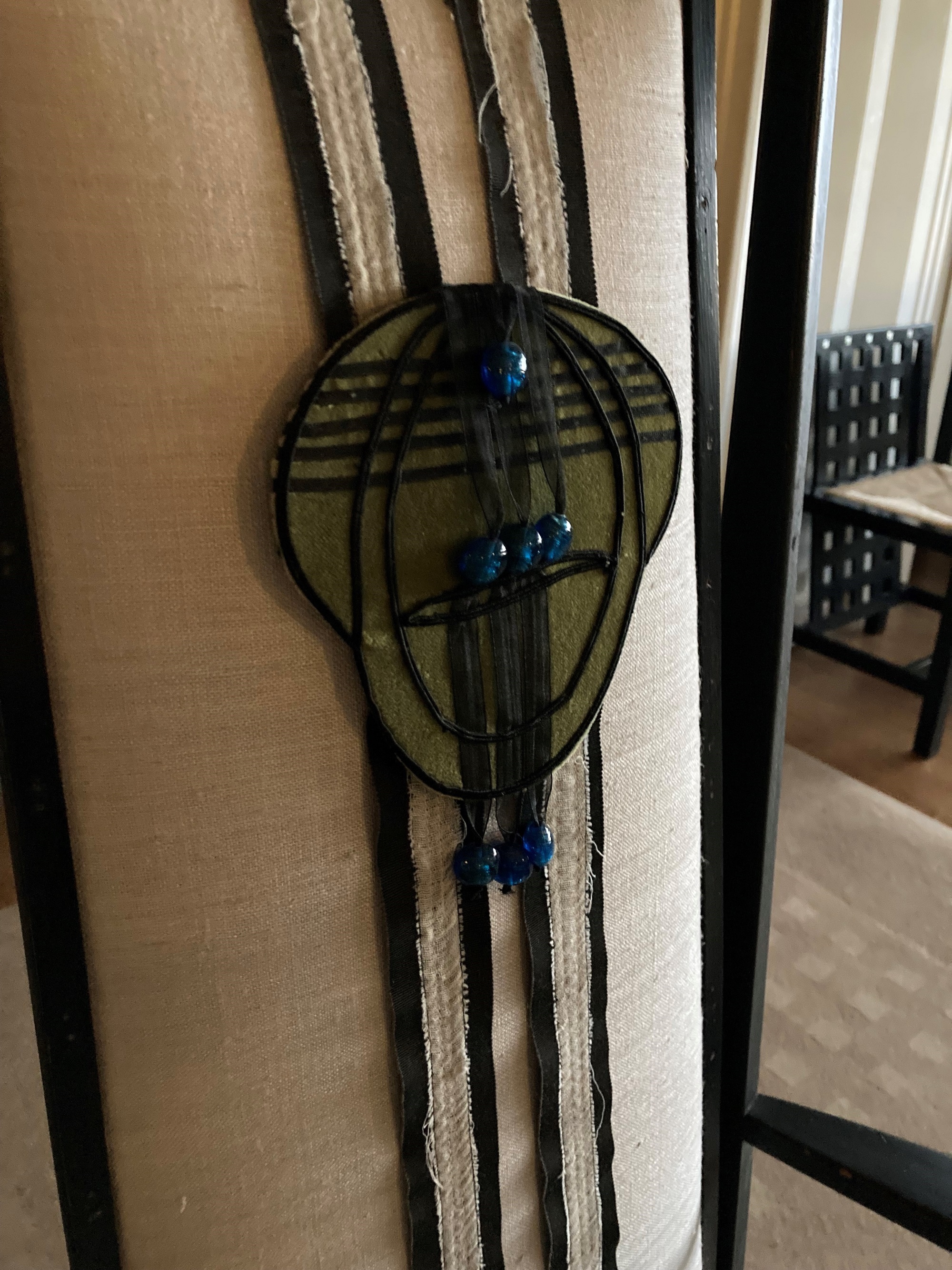 Upstairs in the White Bedroom, visitors will find two embroidered panels, hanging on the large headboard of the main bed. Affectionately referred to as ‘the skinny ladies’ by the Blackie children, these panels are believed to be copies of ‘bed curtains’ once owned by Emil Blumenfelt, first seen at the Vienna Secession exhibition in 1900. The elongated female figures mirror one another, with closed eyes and soft halos, their bowed heads look down upon the sleeper. Simultaneously, two lone eyes look out, perhaps alluding to the Egyptian symbol for the Eye of Horus, which represented protection, health and restoration – a talisman for a good night’s sleep. In these panels and the antimacassars, we see how Margaret embraced and expanded the new possibilities that embroidery offered as well as how she enjoyed this art form at the time. Her use of gesso also demonstrates her individual take on, and mastery of, historical techniques.