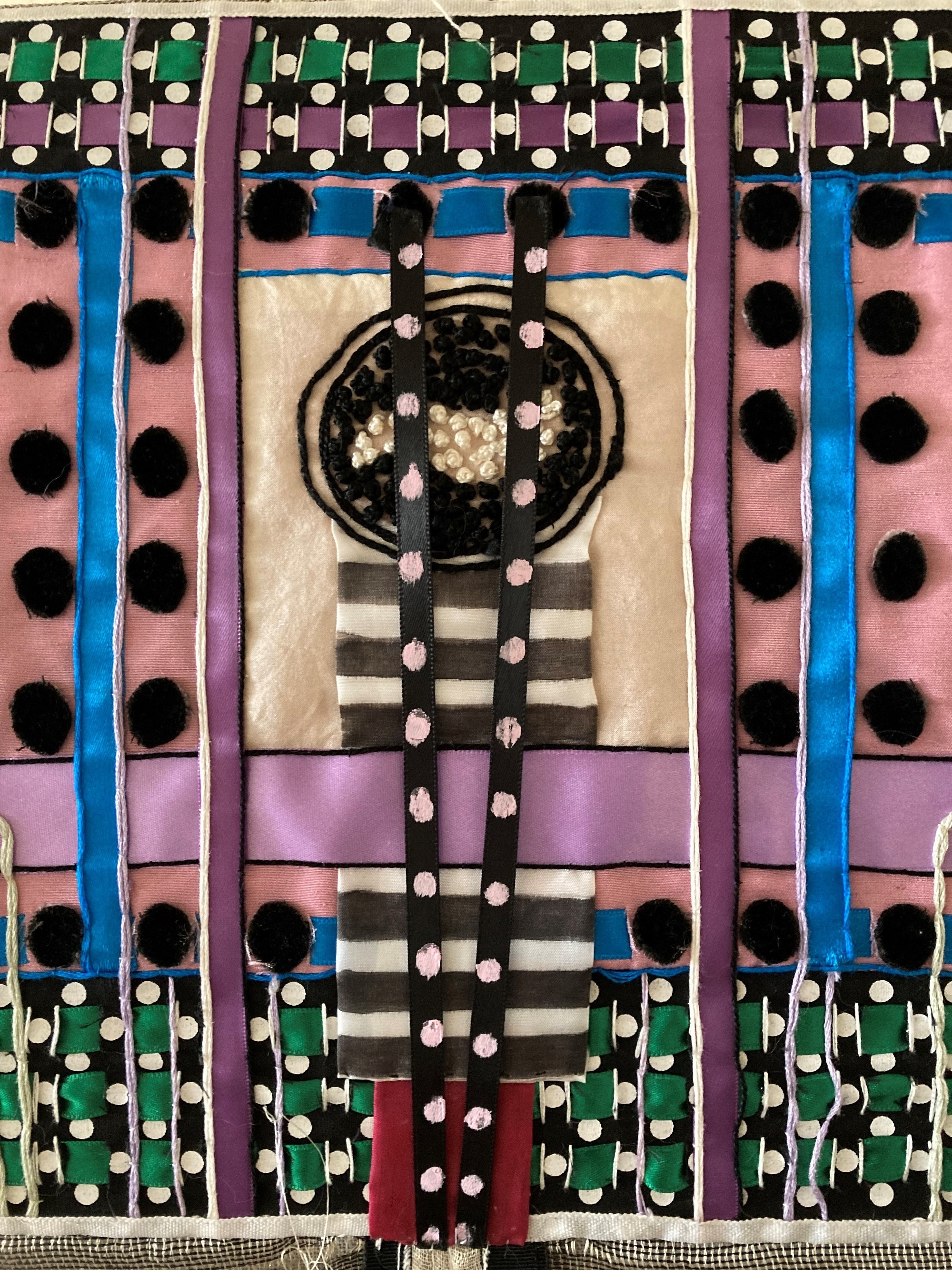 The quote above hangs by the window in the Drawing Room of the Hill House, in which we can experience some of the best examples of Margaret Macdonald’s talent. Her stunning gesso panel The Sleeping Princess sits prominently above the centre of the main fireplace, inviting us to pause awhile and to lose ourselves in its swirling lines, layers of colour, texture, glass beads and pearls, all of which glisten as the light catches them. Meanwhile, the bold geometric antimacassars, that once protected the settle from gentlemen’s hair oil, echo the lines and curves of the wall stencilled design as well as enhance the sharp lines of the settle. The antimacassars display the typical colour palette of the Glasgow Style, with lilac, green and pale pink on cream and black. A table and chairs (designed by Charles Rennie Mackintosh) sit in the centre of the room. Both chairs have embroidered stylised rose leaves, with shimmering dew-like blue beads growing up the long slender back, providing the beginnings of the roses stencilled on the walls.